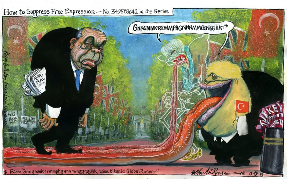 The Guardian, ifade özgürlüğünün ayaklar altına alındığını anlatan bir karikatür de yayınladı. Karikatürde, İngiltere’den uzatılan bir dil üzerinde Erdoğan’ın cebindeki silah anlaşmaları ile yürümesi dikkat çekti.